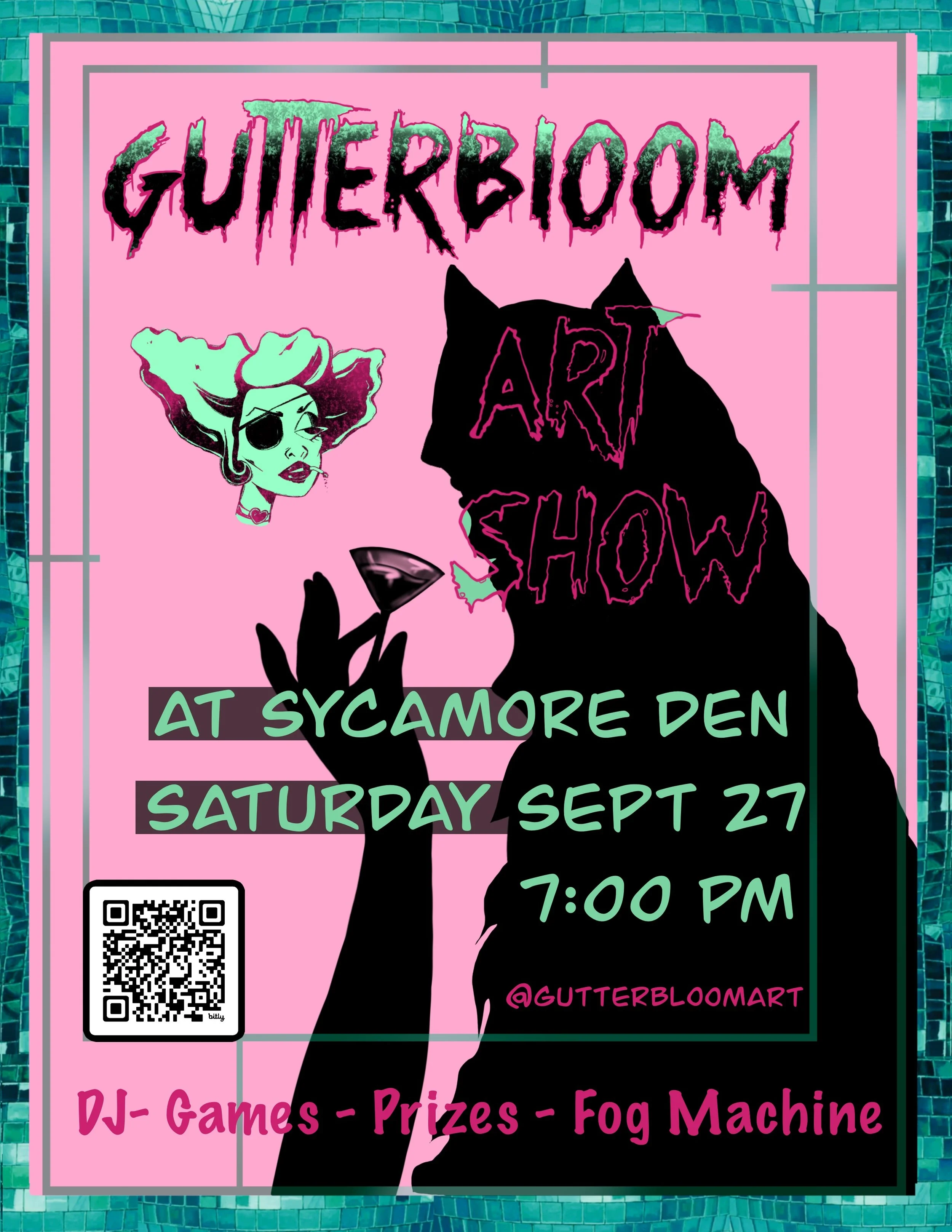 Back to All Events Art show - Sycamore Den Saturday, September 27, 2025 7:00 PM 11:00 PM Google Calendar ICS GutterBloom Art Show - Sycamore Den - Saturday, Sept 27th, 7:00pm 10% Proceeds to Planned Parenthood. Cocktails, Games, Prizes, Fog Machine.